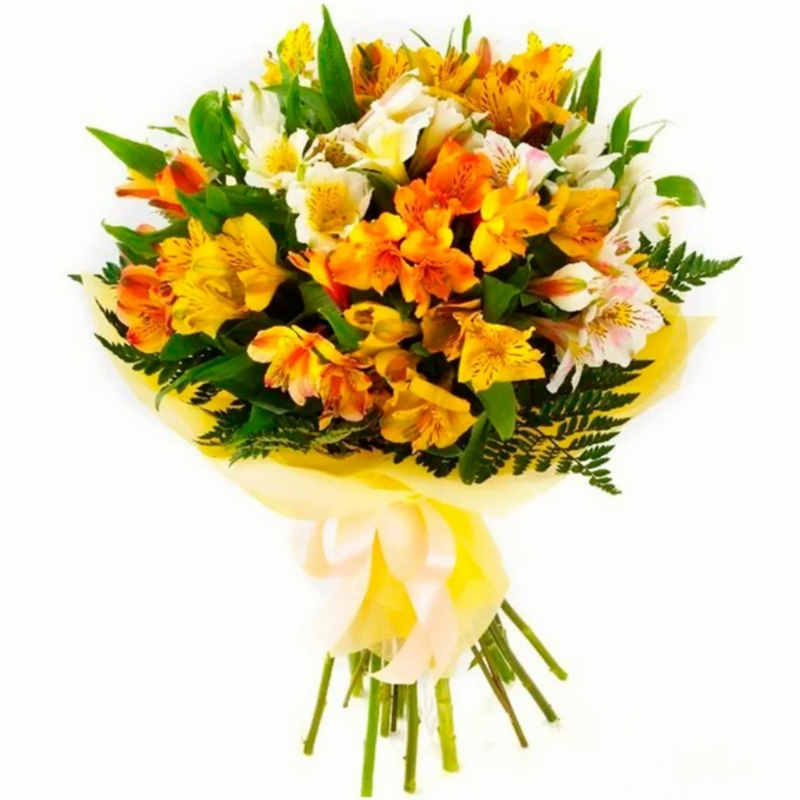 Букет состоит из 11 веток альстромерий, папоротник, салал, красивая упаковка, атласная лента.