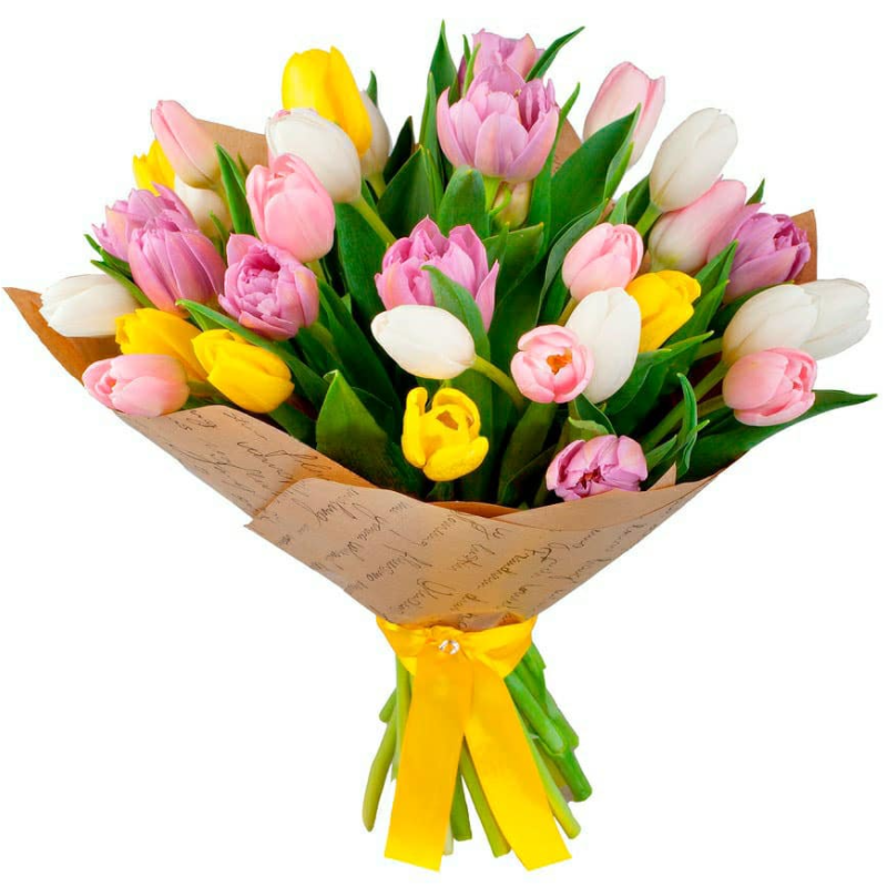 Букет состоит из MIX из 31 белого / желтого и розового тюльпана, крафт, желтая лента.
