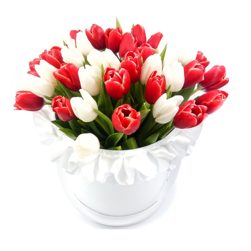 Букет MIX из красных и белых тюльпанов в коробке