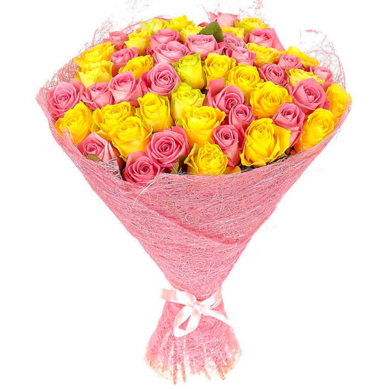 Букет состоит из 23 розовые розы, 22 желтые розы, красивая упаковка, атласная лента.
