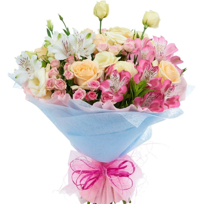 Букет состоит из 5 кремовых роз, 5 веток эустомы, 5 кустовых роз, 4 альстромерии, зелень, красивая упаковка, атласная лента.