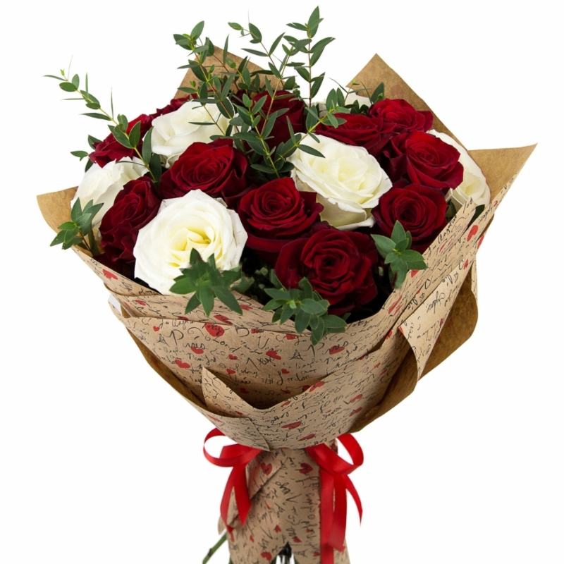 Букет состоит из 11 бордовых роз, 6 белых роз, зелень, крафт, атласная лента.