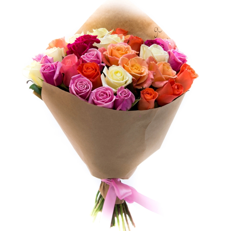 Букет состоит из MIX из 35 роз, крафт, атласная лента.